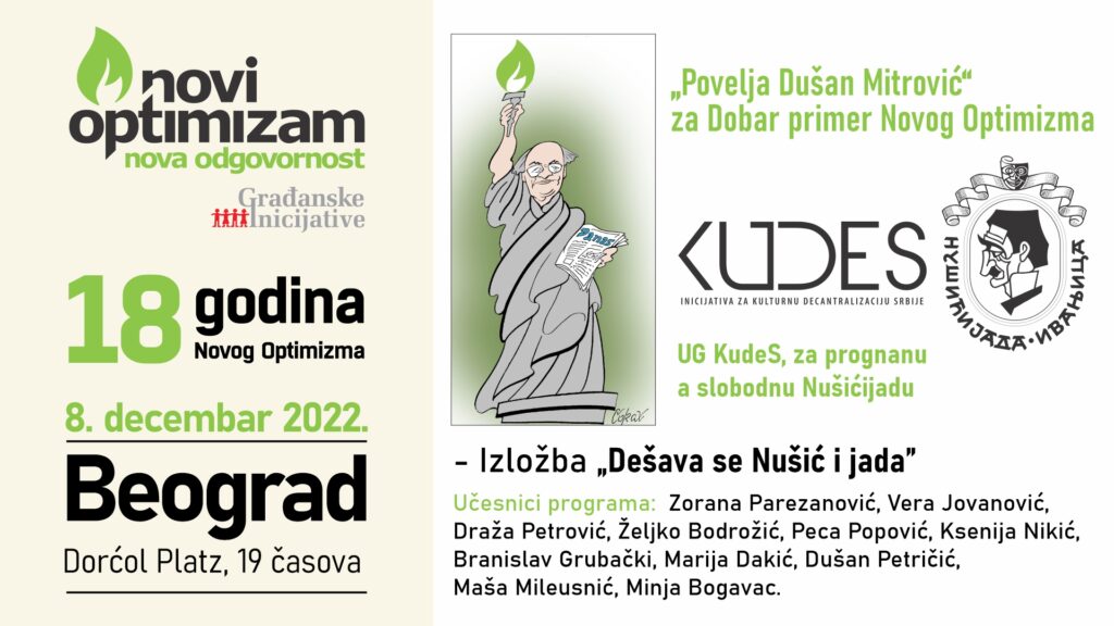 Poštovani i dragi prijatelji, Sa zadovoljstvom vas obaveštavamo da je Kudes dobio svoju prvu nagradu od progona, i to za višegodišnji optimizam u organizovanju prognane a slobodne Nušićijade. Ova tradicionalna nagrada udruženja Novi Optimizam, a koja od prošle godine nosi naziv “Povelja Dušan Mitrović”, KudeSu će biti dodeljena 8. decembra 2022. godine. Udruženje građana KudeS pokrenulo […]
